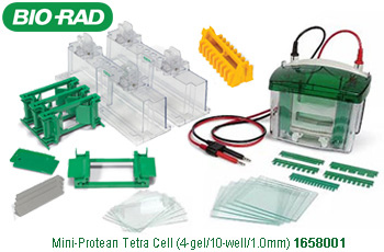 蛋白垂直電泳槽 (4-gel/10-well/1.0mm) | Bio-Rad | 1658001 | 1套 | Mini-PROTEAN Tetra Cell 4-gel system, 1.0mm gel thickness includes: Tank, lid with power cables Mini cell buffer dam; 1×electrode assembly; 1×companion running module(1658038); 2×casting stands, 4 casting frames; 5 sets of short plates and spacer plates; 5×10-well 1.0mm combs 5×gel releasers(1653320) | 詢價 詢價 |