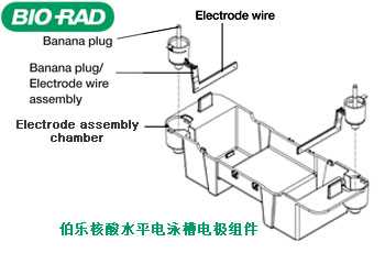 伯樂(lè)核酸水平電泳緩沖液槽的對(duì)角線位置設(shè)置有圓形的電極裝配室(Electrode assembly chamber),分別用于正負(fù)電極組件的安裝。正極為紅色,負(fù)極為黑色,分別連接安全蓋的正極、負(fù)極。正負(fù)電極在電泳時(shí)形成電場(chǎng),使核酸由負(fù)極往正極遷移。