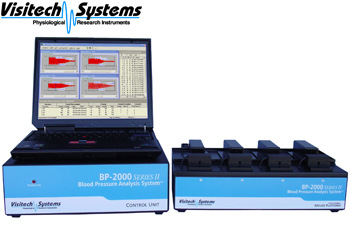 美國(guó)Visitech BP-2000 小動(dòng)物無(wú)創(chuàng)血壓計(jì)可同時(shí)對(duì)多只意識(shí)清醒(conscious)和麻醉(anesthetized)的大、小鼠快速準(zhǔn)確地進(jìn)行心率、收縮壓、舒張壓的直接測(cè)量,并據(jù)此計(jì)算平均動(dòng)脈壓。
