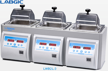 北京Labgic 精密恒溫浴槽控溫精度±0.3℃@37℃,槽內溫度均均一性達到±0.3℃@37℃。W2L-2、W2L-3恒溫水浴槽分別設置有2個、3個容積2L工作浴槽組合裝置,每個工作槽有獨立控制面板,可分別設置工作溫度、時間和啟動與停止控制。